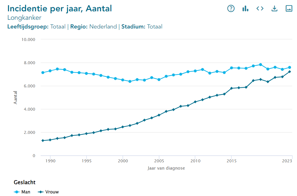 Note: omdat het aantal inwoners toe is genomen, is soms een stijgende lijn te zien terwijl een dalende lijn wordt verwacht. Bijv. als alleen bij 'Overig' een factor 1 wordt ingevuld en bij de anderen een factor 0. Ook de verschuiving in bevolkingspiramide speelt een rol, omdat longkanker pas op hogere leeftijd ontstaat.
